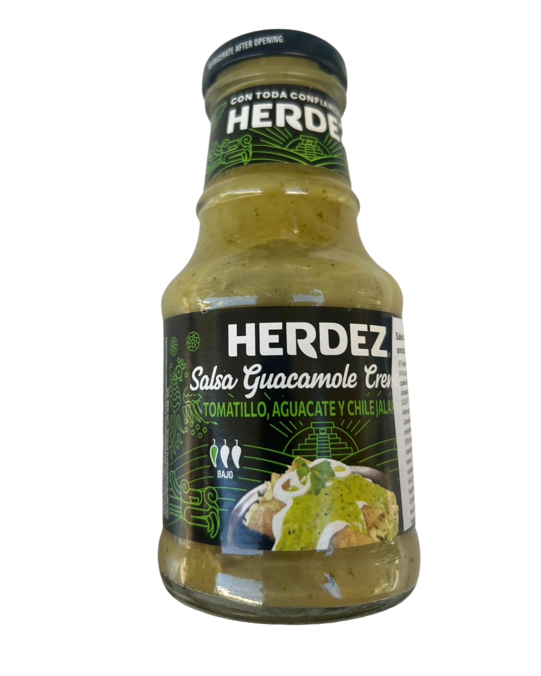 È preparata con una combinazione di avocado, tomatillo (pomodoro verde), peperoncino e spezie, che ricreano il sapore autentico del guacamole in una versione più fluida e pratica. Il gusto è fresco, leggermente piccante e ben equilibrato, ideale per accompagnare diversi piatti.